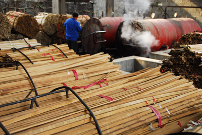 蒸煮碳化,將去掉竹片中的營養(yǎng)成分,使得制造成的竹板材產(chǎn)品質(zhì)地更加緊密結(jié)實,并且不防蟲防蛀。