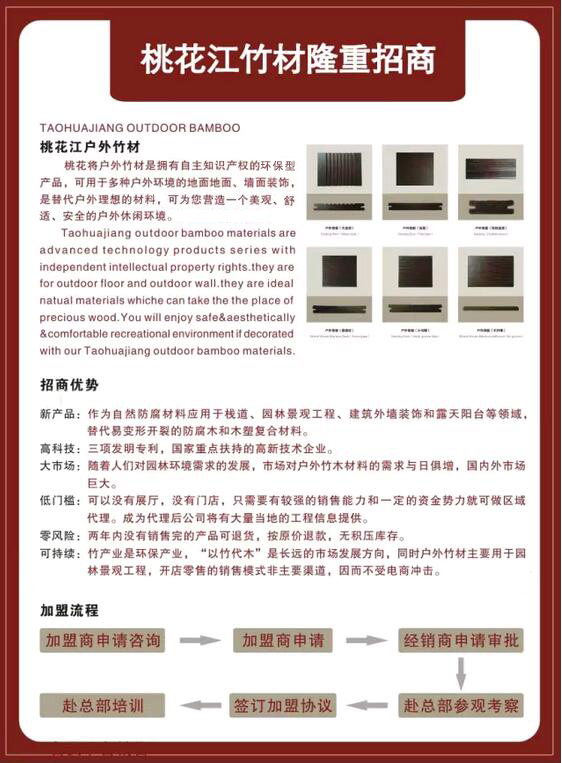 湖南桃花江竹材科技股份有限公司是湖南生產(chǎn)環(huán)保竹材的廠家,地處提名"楠竹之鄉(xiāng)"——湖南益陽市桃江縣,竹子資源得天獨厚。公司成立于2001年7月,注冊資金5076萬,為湖南省農(nóng)業(yè)產(chǎn)業(yè)化龍頭企業(yè)和湖南省林業(yè)工業(yè)龍頭企業(yè),“桃花江”牌系列竹材為湖南竹材產(chǎn)品。公司為中國林重點龍頭企業(yè)和國家高新技術(shù)企業(yè)。公司通過了ISO9001:2008國際質(zhì)量體系認(rèn)證和ISO14001:2004環(huán)境管理體系認(rèn)證。