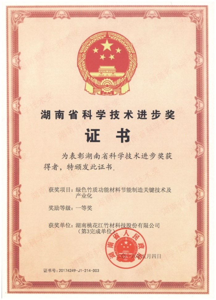 其中, 湖南桃花江竹材科技股份有限公司的綠色竹質(zhì)功能材料節(jié)能制造關(guān)鍵技術(shù)及產(chǎn)業(yè)化項目榮獲2017年湖南省科學(xué)技術(shù)進步一等獎。